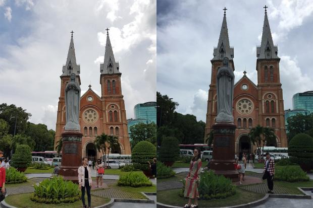 Tiếp tục thử khả năng chụp HDR trên cả hai thiết bị với tượng Đức Mẹ giữa điều kiện nắng trưa rất gắt. Mình cực kỳ ấn tượng với Galaxy S7, nền trời được giữ lại toàn bộ chi tiết cũng như tượng Đức Mẹ rất sáng, chi tiết rõ ràng, trong khi đó iPhone 6 lại bị mất gần như toàn bộ chi tiết ở vùng tối, chỉ thể hiện được chi tiết trên nền trời.