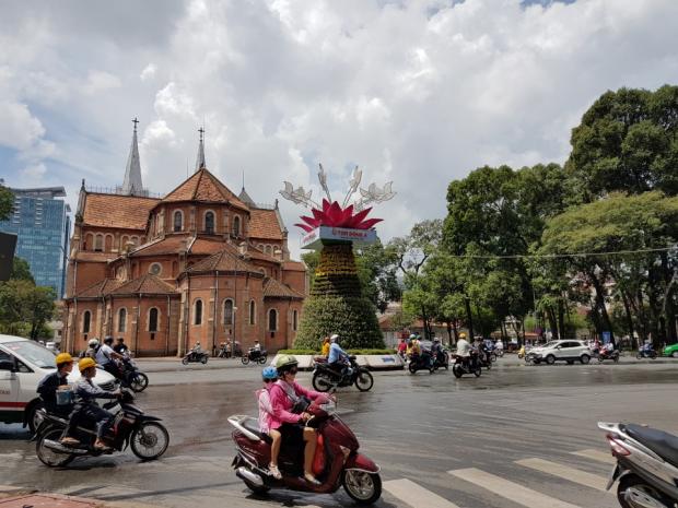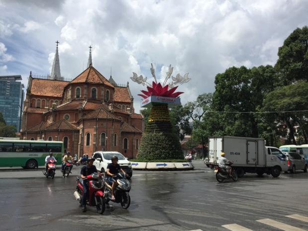 Chạy tới vòng xoay, nắng gắt quá, thế là lại lấy máy ra chụp thêm một ảnh xem với điều kiện ánh sáng như thế này, liệu thuật toán Auto “bá đạo” trên iPhone có thể chiến thắng được Galaxy S7 hay không. Kết quả thật bất ngờ, camera của iPhone 6 tốt, chi tiết vùng trời hầu như được giữ nguyên với màu trời đậm đà hơn so với thực tế, còn chi tiết ở những vùng khác trong ảnh đều bị tối với chi tiết kém, không sử dụng được nhiều. Trong khi đó, camera trên Galaxy S7 giữ lại tốt toàn bộ chi tiết trong ảnh mà không hề bị cháy sáng, rất ấn tượng.