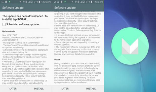 Bản cập nhật Android Marshmallow sẽ được gửi đến người dùng Galaxy J5 (2015) thông qua giao thức OTA. Nếu chiếc điện thoại của bạn vẫn chưa nhận được thông báo này hãy cố gắng kiến nhẫn chờ đợi hoặc có thể tự kiểm tra trong phần Cài đặt - Thông tin thiết bị - Cập nhật phần mềm. File gửi đến có dung lượng 874MB với số phần mềm mới là J500FXXU1BPF4.