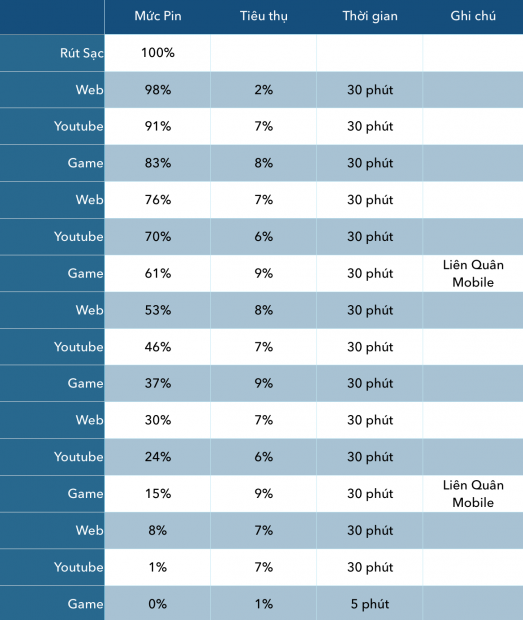 - Thử mỗi tác vụ trong 30 phút đến khi hết pin bao gồm: lướt web (web + chat + fb + đọc báo), xem Youtube, chơi game (Asphalt 8, Liên Quân Mobile), sử dụng tất cả bằng Wifi.