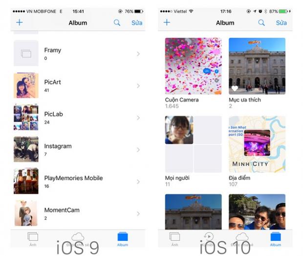 Nâng cấp lên iOS 10, bạn sẽ nhận thấy Apple đã bố trí lại giao diện của album ảnh, cách thức phân loại và sắp xếp cũng có sự thay đổi theo khuôn mặt từng người và cả vị trí chụp. Ngoài ra, điều thú vị là iOS 10 có khả năng tự tạo ra các đoạn video dựa theo ảnh có trong từng album và chèn nhạc.