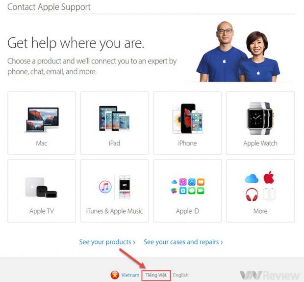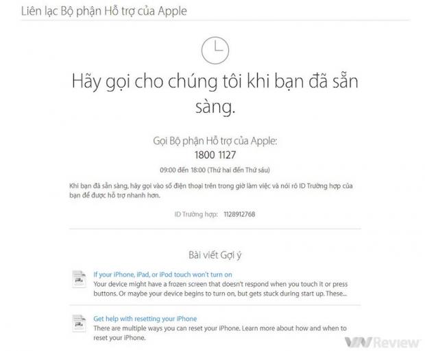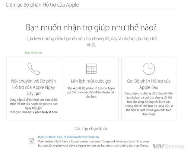 Ngoài việc chủ động gọi cho tổng đài của Apple, người dùng Việt cũng có thể cung cấp số điện thoại trên trang web của Apple để họ gọi cho bạn ngay lập tức hoặc đặt lịch hẹn để bộ phận hỗ trợ gọi cho bạn vào một thời điểm thuận tiện mà bạn muốn. Để thực hiện, bạn truy cập vào địa chỉhttps://getsupport.apple.com/ chọn hiển thị ngôn ngữ Tiếng Việt.