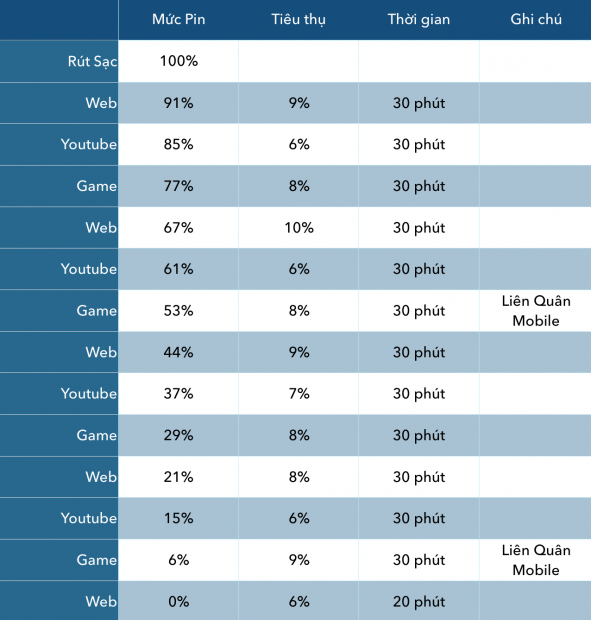 Dù gì đi nữa thì thói quen sử dụng của bạn mới chính là yếu tố đóng vai trò quan trọng trong thời gian sử dụng thực tế của bất kì thiết bị nào. Những con số bên trên chỉ cung cấp cho bạn một cái nhìn tổng quát và từ bảng thời gian tiêu thụ pin mỗi 30 phút bên dưới, bạn hoàn toàn có thể nhẩm ra được xem liệu pin của máy có đủ đáp ứng cho nhu cầu của mình hay không, từ đó đưa ra quyết định đúng đắn trong việc mua máy.