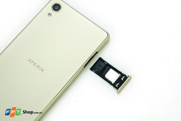 Bên trái sẽ có duy nhất 1 cái khấc dùng để đậy khe sim hoặc khe cắm thẻ nhớ. Năm nay, với Xperia X, bạn có thể sử dụng 2 sim hoặc là phải hi sinh 1 khe sim để lắp thẻ nhớ ngoài. Điều đó tùy thuộc vào cách sử dụng máy của bạn.