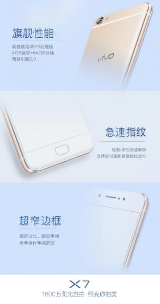 Một số thông số kỹ thuật của Vivo X7 vừa được tiết lộ thông qua hình ảnh quảng cáo từ tài khoản Weibo chính thức của Vivo. Theo đó, X7 sẽ được trang bị một bộ xử lý Snapdragon 652 và sẽ có 4 GB RAM, bộ nhớ trong 64GB.
