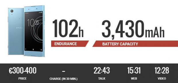 Với thời lượng được đánh giá chỉ hơn 100 giờ, Xperia XA1 Plus là một lựa chọn cho các tín đồ Sony, giá tốt hơn nhiều so với XZ1. Nó có thể xem video trên 15 giờ, duyệt web trên 12 giờ. Tuy nhiên, nó đi kèm với bộ sạc chậm.