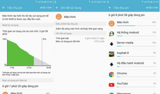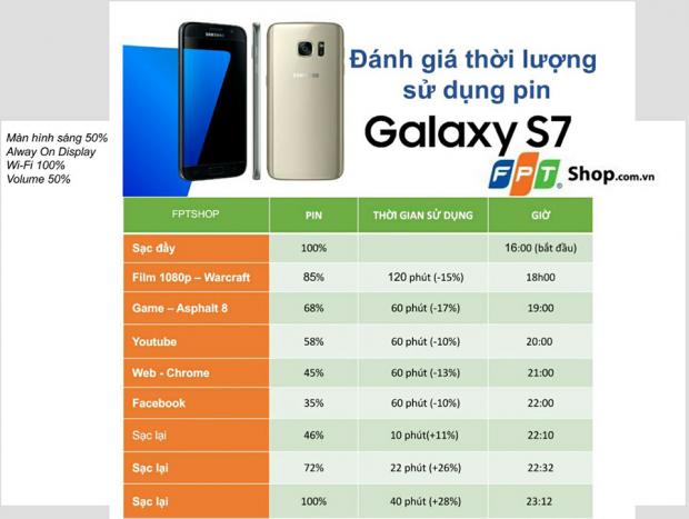 Với việc được trang bị một viên pin lên tới 3.000 mAh, Galaxy S7 cho kết quả rất ấn tượng. Cụ thể với bộ phim 'Đại chiến 2 thế giới - Warcraft' dài khoảng 2h thì Galaxy S7 chạy hết chỉ sụt giảm 15%. Nếu so sánh với các con số mà chuyên trang công nghệ khác cung cấp thì con số 12h - 15h xem video liên tục trên Galaxy S7 là điều không quá khó (tùy thuộc điều kiện thử nghiệm). Các tác vụ khác đều được chạy trong 1h và pin của Galaxy S7 sụt giảm từ 10 cho đến 17%. Tác vụ ngốn pin nhất là chơi game 3D nặng Asphalt 8 còn tác vụ nhẹ nhàng nhất là chơi video.