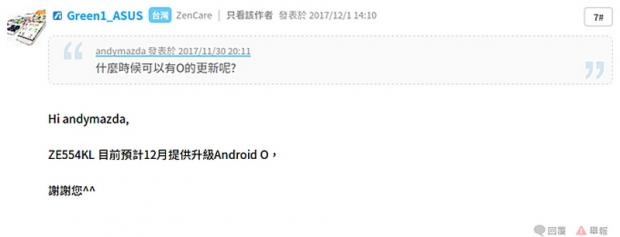 Theo gsmarena, mới đây, một quản trị viên của diễn đàn người dùng Asus đã lên tiếng xác nhận rằng: Phiên bản Android Oreo dành cho ZenFone 4 (ZE554KL) dự kiến sẽ bắt đầu triển khai trong tháng này.
