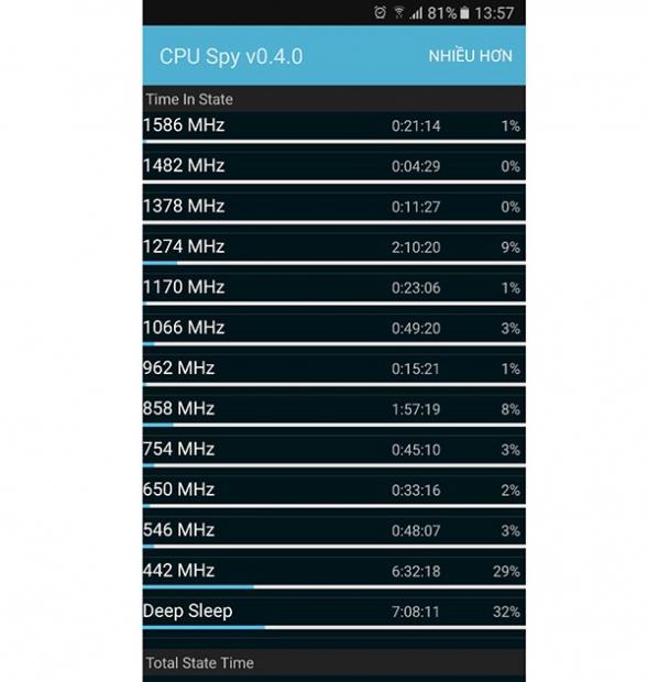 Có một thử nghiệm mà mình không thực hiện trong bài kiểm tra này đó chính là chế độ chờ. Nhưng thực nghiệm mà mình sử dụng cho thấy Galaxy S7 có chế độ chờ rất tốt, tiêu thụ ít năng lượng. Kiểm tra bằng ứng dụng CPU Spy thì dễ thấy Samsung tích hợp chế độ Power Saving trong nhiều ứng dụng thậm chí là cả Game Launcher.