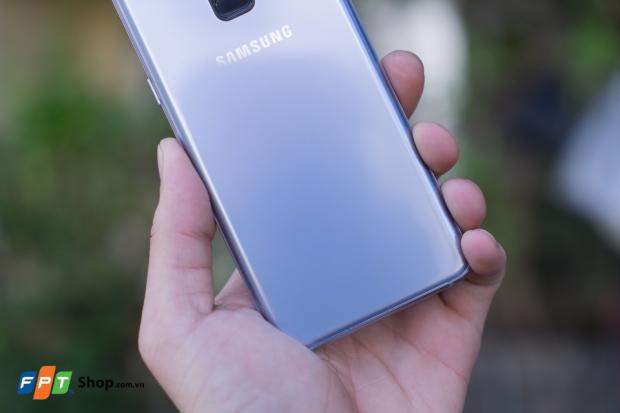 Phần mặt lưng không có nhiều thay đổi so với thế hệ trước, các cạnh máy vẫn được bo cong nhẹ nhàng và bề mặt lưng được làm phẳng hơn, vì vậy mà cầm thiết bị này trông thích tay thỏa mái. Điểm nhấn đáng chú ý trên A8 (2018) là Samsung đã di chuyển cảm biến vân tay máy ra mặt sau và đặt nó phía dưới camera. Vị trí này giúp thao tác dễ dàng và thuận tiện hơn.
