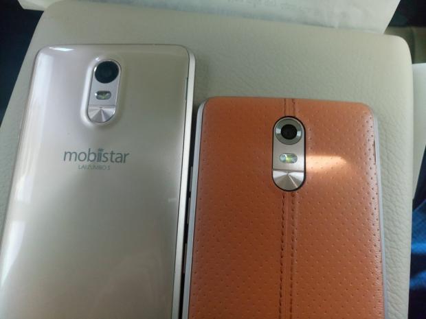 2 chiếc điện thoại nằm sát nhau cùng chung một ngôn ngữ thiết kế nhưng mặt lưng chiếc máy bên trái có vẻ được làm từ nhựa và bên còn lại là da giống như cái cách mà LG G4 đã từng làm. LG G4 có 1 đường may còn sản phẩm của Mobiistar sẽ có 2 đường chạy song song ở giữa.