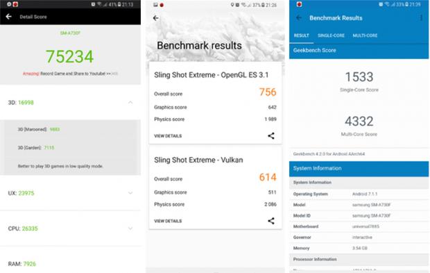 Hiệu năng của Galay A8+ 2018 tất nhiên không thể sánh ngang hàng các flagship, vì đây chỉ là máy cận cao cấp mà thôi, nhưng ở mức khá ổn với những tác vụ của đa số người dùng. Nhưng việc trang bị tận 6 GB RAM cho dòng A là một điểm đáng khen cho Samsung.