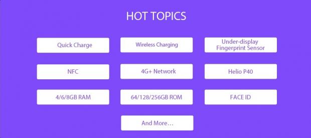 Ở mục này, chúng ta có thể thấy được một số chủ đề nóng hổi mà LEAGOO đã liệt kê ra là sạc nhanh, sạc không dây, cảm biến vân tay dưới màn hình, NFC, 4G LTE, chip Helio P40, 4/6/8 GB Ram, 64/128/256 GB bộ nhớ trong và Face ID.