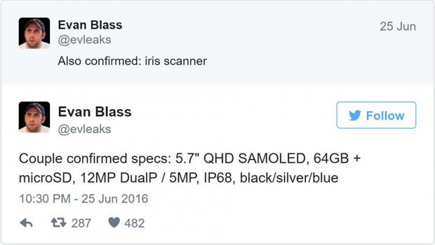 Ngoài ra, sau đó, Evan cũng chia sẻ thêm rằng Note 7 có thêm được công nghệ quét võng mạc - Iris Scanner ở camera phía trước.