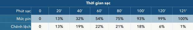 Thực tế thử nghiệm cho thấy thời gian sạc đầy viên pin của máy từ lúc cạn lên 100% là khoảng 2 tiếng. Chi tiết quá trình sạc đều được ghi nhận lại trong bảng bên dưới.