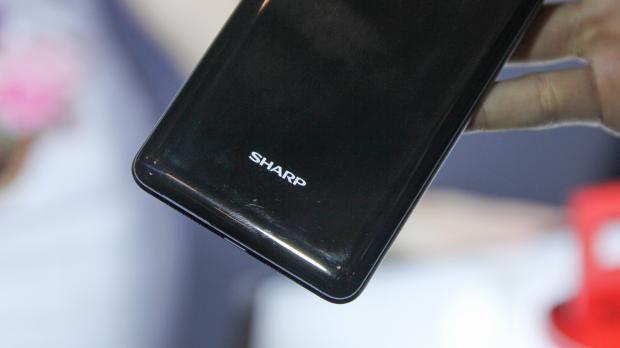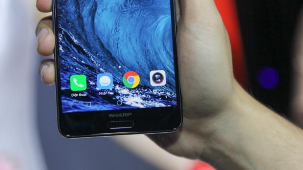 Các phím điều hướng được đặt trong màn hình, bên dưới là cảm biến vân tay một chạm cùng logo. Cá nhân mình thấy giá như Sharp chuyển phần cảm biến vân tay sang mặt lưng thì đẹp hơn chứ nhỉ.