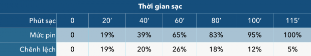 Thực tế thử nghiệm cho thấy thời gian sạc đầy viên pin của máy từ lúc cạn lên 100% là khoảng 1 tiếng 55 phút. Chi tiết quá trình sạc đều được ghi nhận lại trong bảng bên dưới.