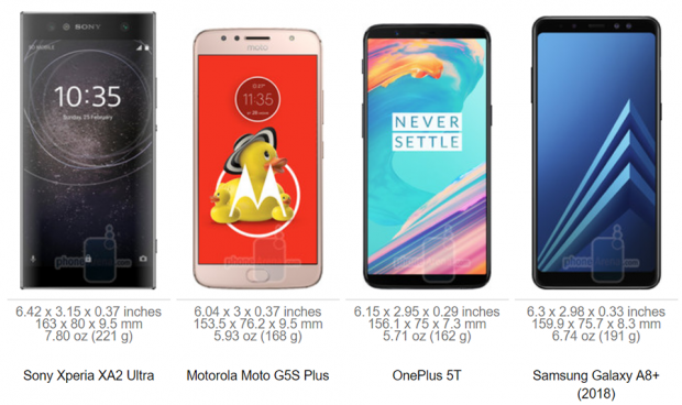 Để trả lời cho câu hỏi này thì mới đây trang tin Phonearena đã có sự so sánh về kích thước cũng như khối lượng rất chi tiết của bộ đôi Xperia XA2 và XA2 Ultra với một số đối thủ tầm trung nổi bật khác đến từ các hãng như Samsung, LG, OnePlus hay Motorola. Các bạn có thể xem qua hình ảnh trên đây nhé!