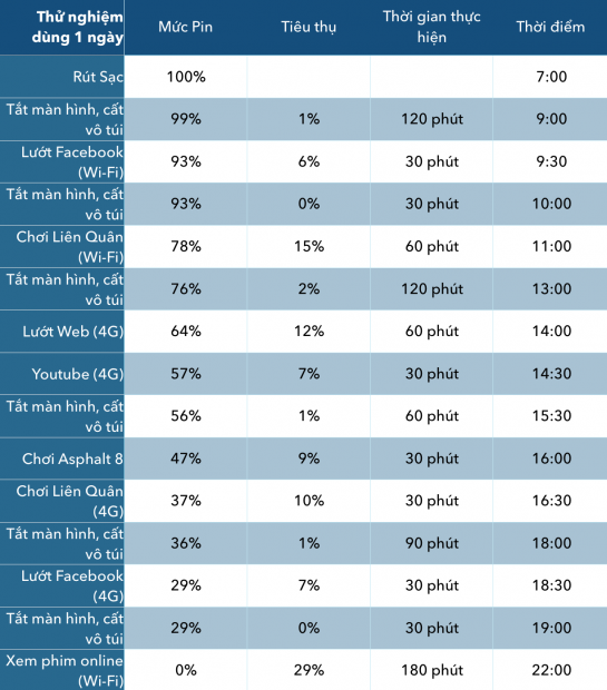 Lần lượt thực hiện 5 tác vụ: Lướt Web, Lướt Facebook, Xem Youtube, Chơi game Offline và Chơi game Online cho đến khi hết pin.