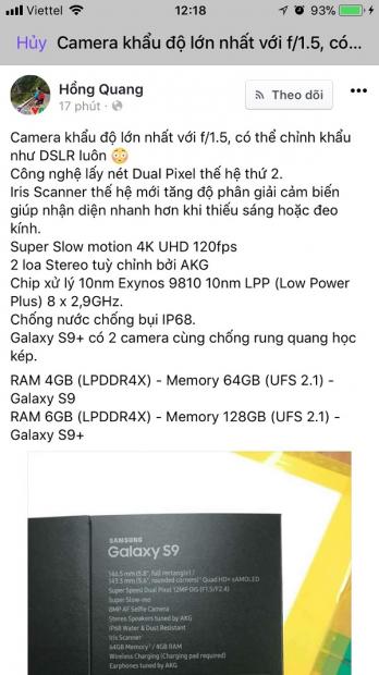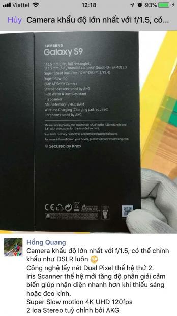 Cụ thể, mới đây trên một trang Facebook cá nhân tại Việt Nam, một hình ảnh trên tay hộp đựng Galaxy S9 đã được đăng tải. Đặc biệt hơn, cấu hình chi tiết của máy cũng được liệt kê, cụ thể: