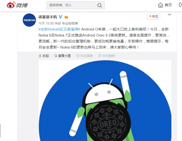 Và hôm nay, trên tài khoản Weibo chính thức của Nokia xác nhận rằng hãng đã bắt đầu tung ra Android 8.0 Oreo cho Nokia 6 (2018) và Nokia 7.