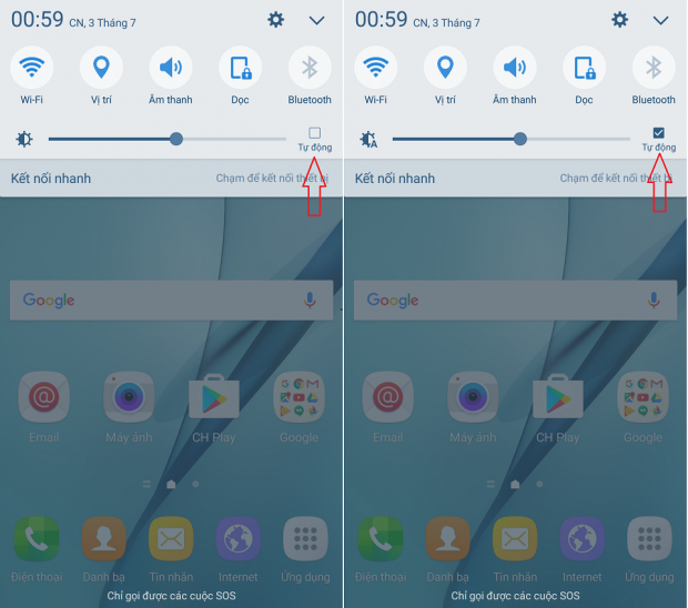 Cài đặt này khá quan trọng bởi trong nhiều trường hợp nó sẽ giúp máy sẽ tự động tối ưu độ sáng màn hình sao cho phù hợp nhất với mắt và môi trường xung quanh. Và phần nào đó nó cũng sẽ giúp hệ thống tối ưu được năng lượng tiêu thụ của màn hình hiển thị. Ở màn hình chính các bạn kéo thanh thông báo và tích vào phần tự động để bật lên cài đặt này.