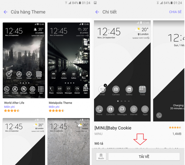 Cũng như chọn hình nền, khi các icon càng đơn giản và ít màu sắc thì màn hình AMOLED trên Galaxy A9 Pro càng phát huy tác dụng đó là tiết kiệm pin của mình. Và các bạn chỉ cần vào trong kho Theme trong ứng dụng mà Samsung cài đặt sẵn để tải về mà thôi.