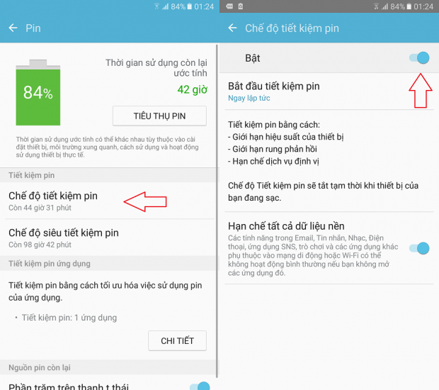 Các quá trình chạy nền sẽ tiêu tốn kha khá pin của Galaxy A9 Pro ngay cả khi không sử dụng vì thế nếu bạn muốn có thời lượng pin tốt hơn có thể kích hoạt chế độ tiết kiệm pin thông thường để nâng cao thời gian sử dụng. Trong phần quản lý pin các bạn sẽ thấy cài đặt tiết kiệm pin, hãy kích hoạt nó lên.
