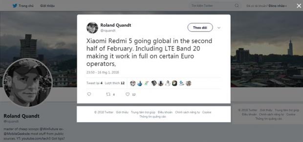 Chuyên gia rò rỉ @Rquandt tiết lộ trong một tweet rằng Redmi 5 sẽ ra mắt toàn cầu vào nửa cuối tháng 2 sắp tới. Người này cũng cho biết thêm là điện thoại này sẽ hỗ trợ băng tần LTE 20. Trong khi sản phẩm ở Trung Quốc chỉ hỗ trợ các băng tần FDD LTE 1, 3, 5, 7 và 8.