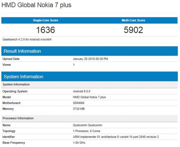 Trên trang web Geekbench, Nokia 7 Plus sẽ được tích hợp hệ điều hành Android Oreo, vi xử lý Snapdragon 660, một sự nâng cấp so với Snapdragon 630 trên Nokia 7. Ngoài ra, máy còn có bộ nhớ RAM 4 GB.
