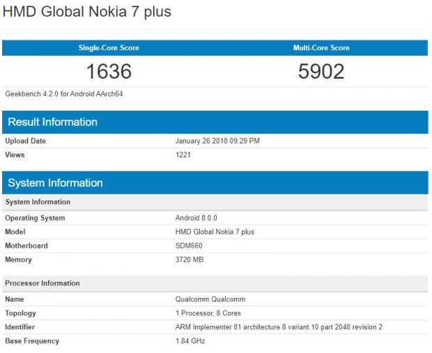 Nokia 7 Plus xuất hiện trên Geekbench: Android Oreo, Snapdragon 660, RAM 4 GB