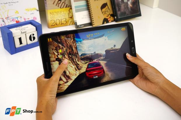 Về cấu hình, Samsung Galaxy Tab A 10,1 inch 2016 được trang bị xử lý lý hiệu năng cao 8 nhân 64-bit xung nhịp 1,60GHz, đi kèm dung lượng RAM 2GB, đủ để máy đảm đương tốt mọi tựa game đỉnh cao trên nền tảng Android hiện nay như Asphalt 8 hay Modern Combat 5. Tất nhiên, mọi thao tác đều được phản hồi một cách nhanh chóng và chính xác, hầu như không hề xảy ra hiện tượng giật lag hay đứng hình.