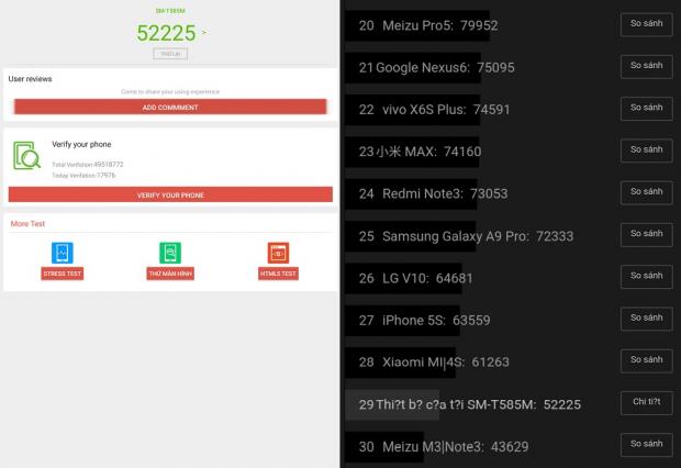 Samsung Galaxy Tab A 10,1 inch 2016 nhận được số điểm hơn 52000 từ phần mềm đánh giá Antutu Benchmark. Với số điểm này, chúng ta hoàn toàn có thể tin tưởng thiết bị đủ khả phục vụ tốt nhu cầu giải trí của các game thủ.