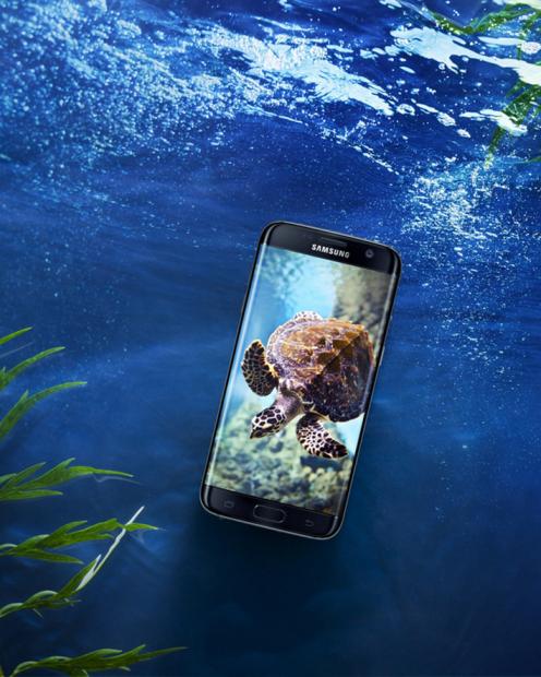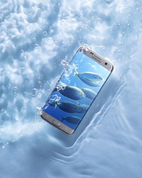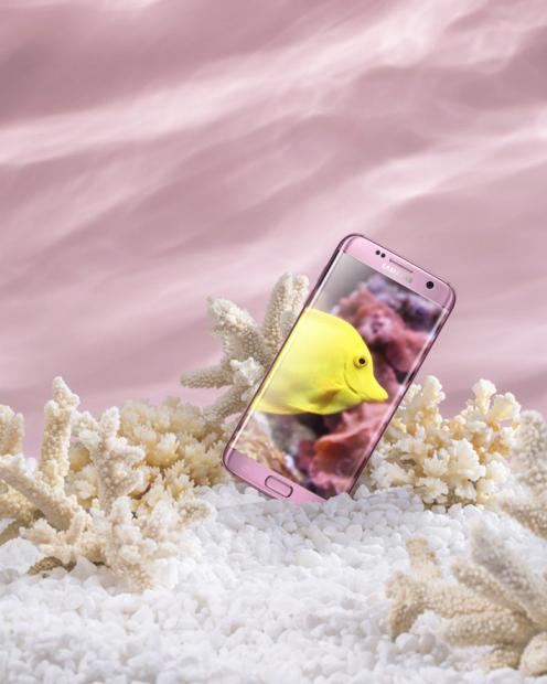 Bức ảnh Galaxy S7 edge màu bạc titanium được bài trí khéo léo đến từng chi tiết với khung cảnh buổi chiều mát lành. Hình nền đàn cá được cài đặt sẵn ẩn ý về khả năng thể hiện hình ảnh một cách chân thực của máy. Màu bạc cũng là màu lần đầu xuất hiện trên dòng sản phẩm Galaxy S và cực kì được ưa chuộng trong khoảng thời gian S7 edge mới ra mắt.