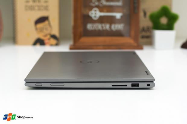 Ở cạnh phải, ta có nút nguồn, cụm phím tăng giảm âm lượng, khe đọc thẻ nhớ, cổng USB 2.0 và lỗ khoá laptop.