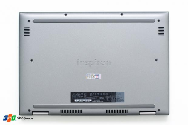 Mặt đáy đơn giản với 2 đường cao su chạy dài có tác dụng nâng máy lên cao hơn so với mặt phẳng. Ngoài ra, ta có loa ngoài kép được đặt ở hai cạnh bên và khe hút gió được đặt ở sát mép bản lề. Thử nghiệm thực tế cho thấy loa ngoài của Dell Inspiron 13-5368 khá ổn, âm lượng vừa phải, chất âm trong, không bị vỡ hạt, đủ sức đáp ứng các nhu cầu sử dụng hằng ngày. Pin của máy là pin liền gắn bên trong, không cho phép tháo rời.