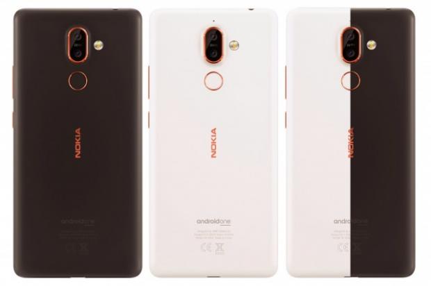 Chiếc smartphone Nokia 7 Plus màu trắng có mặt trước, camera, cảm biến vân tay, logo Nokia màu đồng làm điểm nhấn. Dường như phiên bản màu đen của Nokia 7 Plus cũng có cách trang trí tương tự.