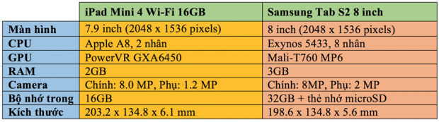 Thị trường máy tính bảng đang trở nên cực kỳ sôi động với sự xuất hiện của hai sản phẩm tiêu biểu là iPad Mini 4 Wi-Fi 16GB và Samsung Tab S2 8 inch sở hữu những tính năng, thiết kế khác nhau. Người dùng muốn chọn cho mình một chiếc máy tính bảng ưng ý, đáp ứng đầy đủ nhu cầu sử dụng không phải là điều dễ dàng. Do đó mà hôm nay, sẽ thực hiện bài so sánh nhanh giữa hai sản phẩm nhằm giúp người dùng có thể hiểu rõ hơn về 2 sản phẩm này.