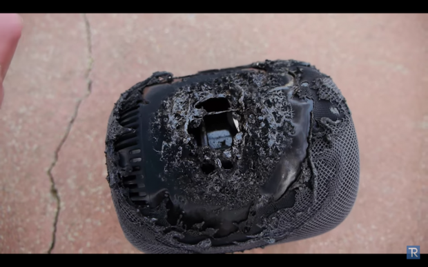 Tò mò về điều gì sẽ xảy ra khi đốt cháy loa Apple HomePod, kênh YouTube có tên TechRax đã thực hiện màn thử lửa đầy tốn kém với loa Apple HomePod bằng đèn khò ở nhiệt độ cao. Trong những giây đầu tiên của màn thử lửa, lớp lưới bảo vệ loa HomePod bằng vải nhanh chóng bị cháy và để lộ phần thân màu đen được làm từ nhựa cứng của loa. Dù vậy, chiếc loa vẫn hoạt động bình thường và vẫn sáng đèn ở phía mặt trên.
