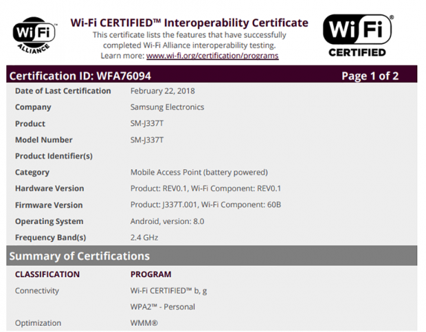 Cụ thể, theo thông tin mới được chia sẻ từ trang TheAndroidSoul, một smartphone Samsung mới vừa đạt chứng nhận từ tổ chức Wifi Alliance với tên mã SM-J337T. Đây là một trong những điều kiện cần thiết để một thiết bị tiến ra thị trường khi bất cứ điện thoại nào trước khi ra mắt đều cần thông qua khá nhiều các chứng nhận, tiêu chuẩn khác nhau như TENAA, FCC, Bluetooth Sig, Wifi,…Được biết, dựa vào tên mã thì nhiều khả năng đây chính là mẫu Galaxy J3 2018 sẽ được Samsung trình làng trong thời gian sắp tới và với ký tự “T” thì nhiều khả năng đây sẽ là một phiên bản nhà mạng T-Mobile của Mỹ.