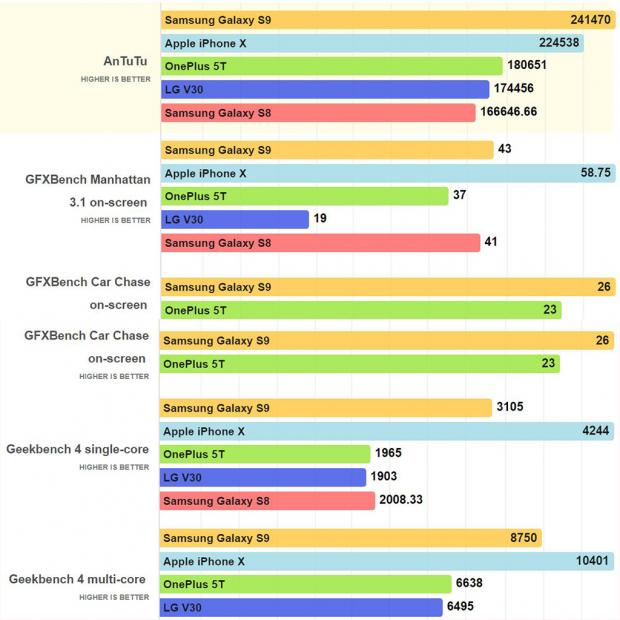 3 phần mềm được sử dụng để đánh giá hiệu năng của Galaxy S9 là AnTuTu, GFXBench và Geekbench 4. Các kết quả đều cho thấy Galaxy S9 vượt trội so với hầu hết các smartphone Android đang có mặt trên thị trường hiện nay tuy nhiên khi so sánh với Apple iPhone X thì Galaxy S9 chỉ 'chiến thắng' duy nhất ở phần chấm điểm AnTuTu. Các bạn cũng lưu ý là phiên bản Galaxy S9 được thử nghiệm chưa phải là bản chính thức và bạn phải chờ tới ngày 16/03 để có một cái nhìn khách quan nhất.