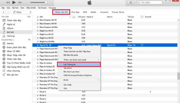 Bước 1: Trên iTunes, các bạn vào phần Nhạc của tôi, nơi đây sẽ hiển thị toàn bộ bài hát có trong máy tính của bạn. Sau đó chọn bài hát bạn muốn cắt làm nhạc chuông và nhấn chuột phải vào bài hát đó chọn Lấy thông tin.