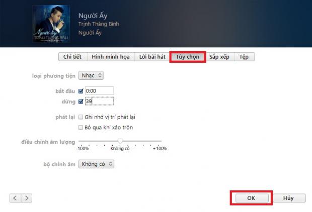 Bước 2: Hộp thoại mới hiện ra, các bạn chọn mục Tuỳ chọn, rồi chọn thời điểm bắt đầu và dừng để cắt nhạc (không quá 40 giây). Sau đó, nhấn nút OK.
