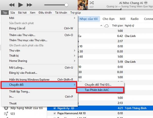 Bước 3: Chọn bài hát vừa cắt, bấm vào Tệp > Chuyển đổi > Tạo phiên bản AAC.