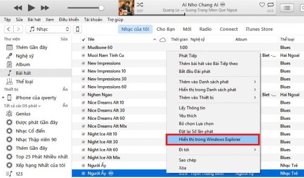 Bước 4: Bây giờ sẽ xuất hiện thêm một bản nhạc vừa được cắt ngay bên dưới bài hát gốc mà bạn vừa chọn. Tiếp tục bấm chuột phải vào file vừa cắt, chọn Hiển thị trong Windows Explorer để mở thư mục chứa file đó ra.