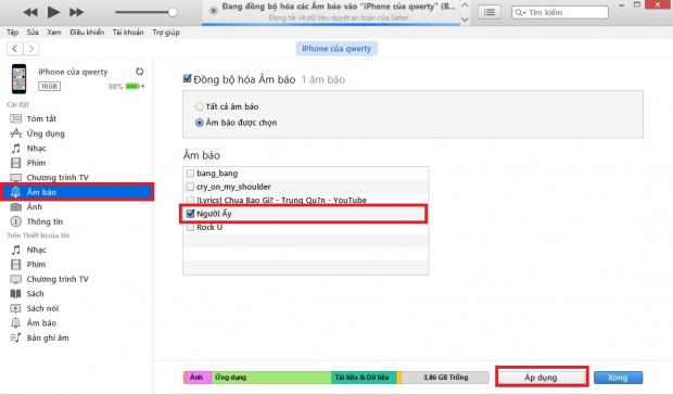 Bước 6: Quay trở lại iTunes, nhấn vào biểu tượng iPhone như hình dưới, chọn Nhạc chuông ở menu bên trái màn hình, các bạn nhấn Ctrl+O, chọn file đuôi m4r vừa tạo rồi nhấn Mở. Sau đó, ở cột bên phải tích chọn vào Đồng bộ hoá Âm báo và Âm báo được chọn. Cuối cùng nhấn vào Áp dụng để đồng bộ nhạc chuông là xong.