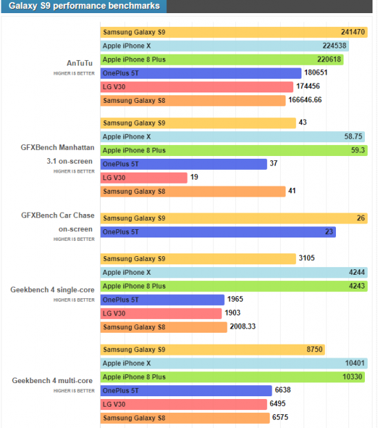 Cụ thể, Phonearena đã thực hiện bài kiểm tra hiệu năng của Galaxy S9 phiên bản chip Exynos 9810 trên 3 phần mềm benmark là Antutu, GFXBench và Geekbench 4. Kết quả cho thấy, điểm hiệu năng của Galaxy S9 là vô cùng ấn tượng khi vượt qua hàng loạt các đối thủ khác để dẫn đầu danh sách về hiệu năng trên ba ứng dụng chấm điểm hiệu năng này. Thậm chí, siêu phẩm iPhone X của Apple với số điểm số trên Antutu tưởng chừng như “vô địch” là 224,538 cũng bị Galaxy S9 vượt mặt. Tuy nhiên, cần lưu ý rằng kết quả này chỉ là kết quả tham khảo và không thật sự chính xác để đánh giá sức mạnh của một chiếc smartphone.