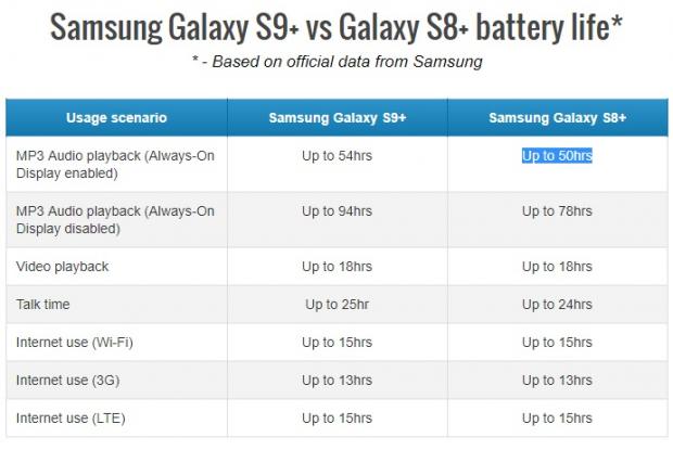 Theo số liệu mà Samsung công bố, Galaxy S9 có thể phát nhạc liên tục (Không sử dụng Always on Display) trong khoảng 80 giờ đồng và 48 giờ nếu sử dụng Always on Display, cùng nhu cầu trên Galaxy S8 chỉ đạt được thời gian lần lượt là 67 giờ và 44 giờ.