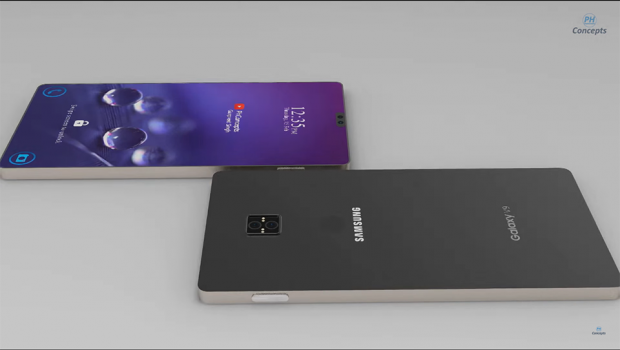 Kênh YouTube PHConcepts mới đây vừa giới thiệu mẫu concept Galaxy V9 có thiết kế vô cùng đẹp mắt và ấn tượng. Theo đó, chiếc Galaxy V9 này có ngoại hình khá vuông vức và nam tính với bốn góc được bo tròn nhẹ. Mặt trước của điện thoại gần như không có viền màn hình ở 4 cạnh. Và tựa như chiếc iPhone X của Apple thì viền màn hình trên của Galaxy V9 cũng chừa ra một cái rãnh nhỏ để chứa cụm camera selfie kép của máy.