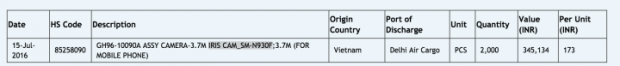 Theo đó, trên trang xuất nhập khẩu smartphone Ấn Độ, đã có tới 2.000 chiếc IRIS CAM_SM-N930F đang được thử nghiệm. Lưu ý với các bạn tên mã “SM-N930F” chính là của Galaxy Note 7.